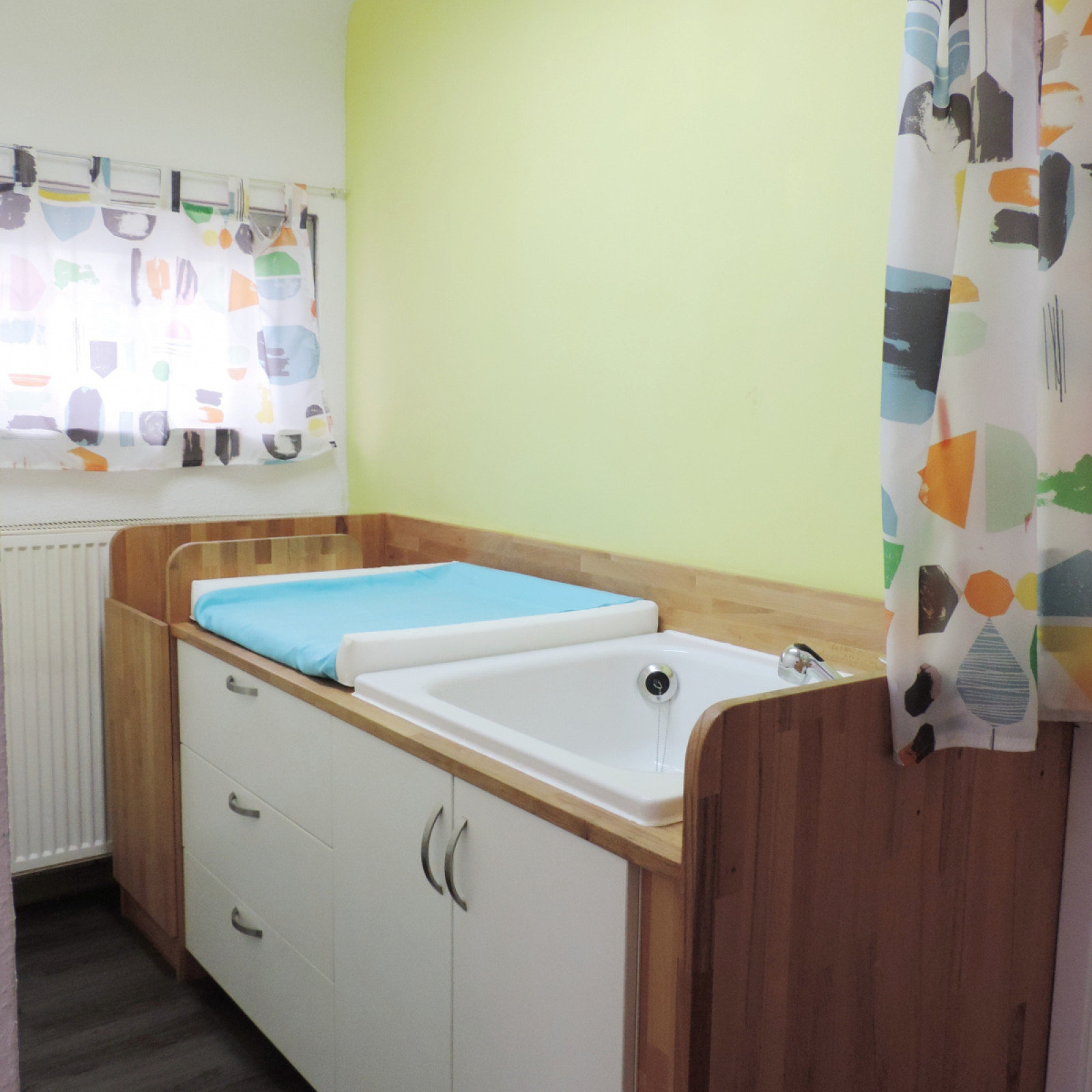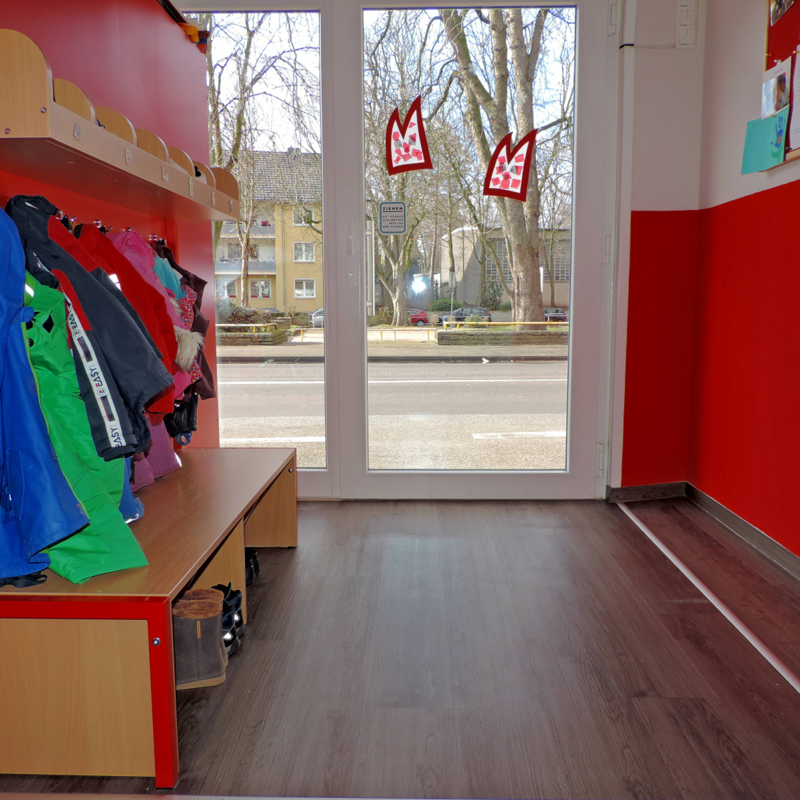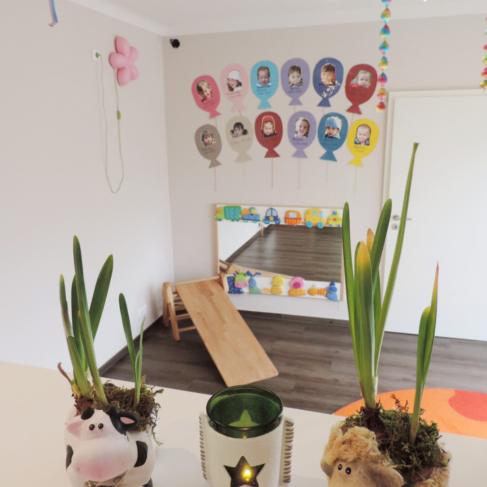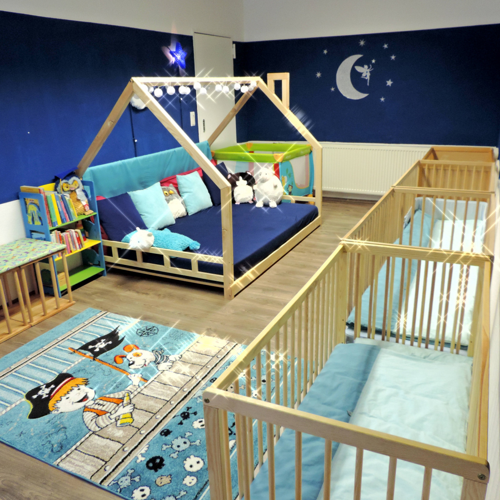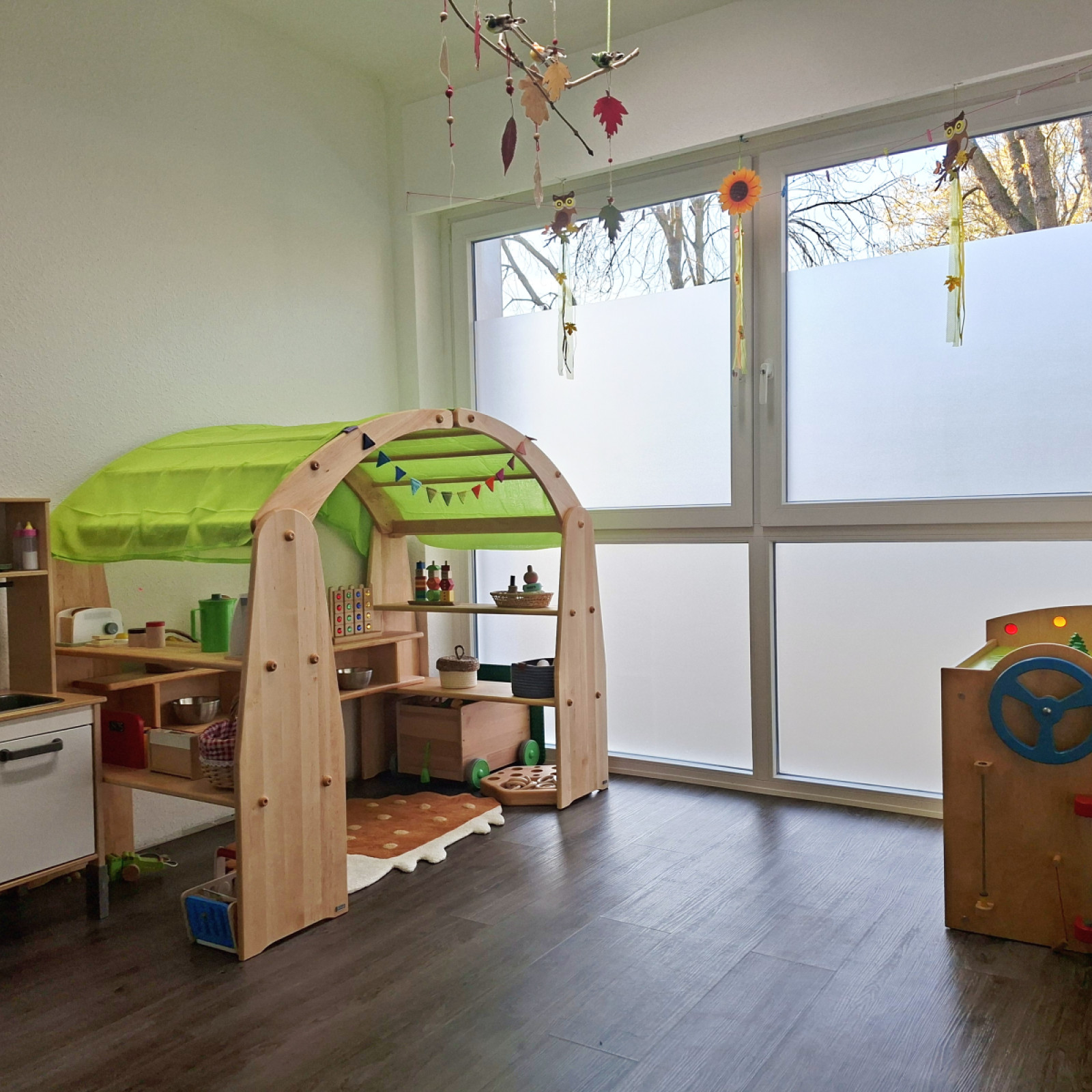Die Räume sind an die Bedürfnisse der Kinder angepasst. Der Waschbereich ist mit einer Wickelstation ausgestattet. Im Schlafbereich können sich die Kinder ausruhen und Kraft für neue Abenteuer tanken. In der Küche kümmere ich mich um die ausgewogene Versorgung der Gruppe. Dabei binde ich die Kinder mit ein und mache das Mittagessen so zum gemeinsamen Erlebnis. Durch verschiedene eigene Bereiche schaffe ich zudem kleine Inseln zum Basteln, Spielen und Toben.